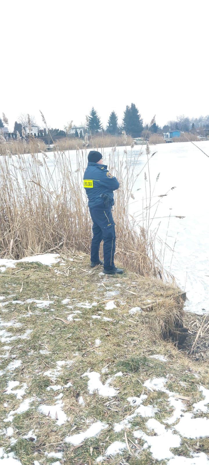 Od początku, gdy tylko pojawił się mróz funkcjonariusze Straży Miejskiej sprawdzają akweny znajdujące się na terenie naszego miasta aby zapewnić bezpieczeństwo osób, a w szczególności dzieci, które mogą próbować bawić się na tafli lodu zamarzniętego zbiornika wodnego. Przebywanie na lodzie w takich warunkach jest skrajnie niebezpieczne i nieodpowiedzialne. Człowiek, który dostanie się pod lód nie jest w stanie samodzielnie się wydostać, a jego szanse na uratowanie i przeżycie są bardzo minimalne. Dlatego apelujemy o zachowanie zdrowego rozsądku, aby nie narażać się na zagrożenie utraty życia i zdrowia!